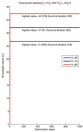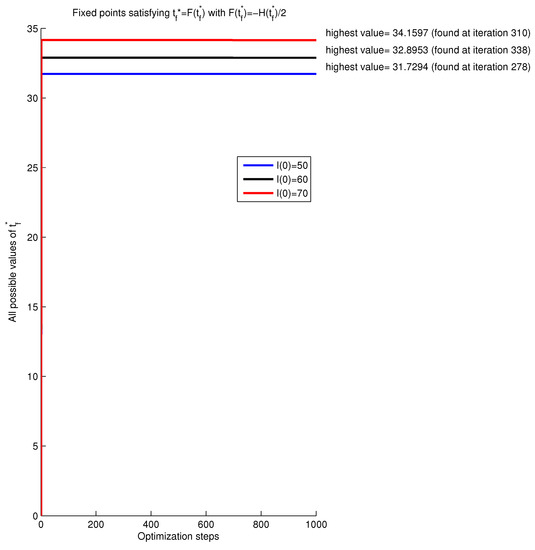 In Figure 4, we show the impact of the initial condition of I function, namely , on fixed points , and we can deduce from the obtained optimal horizons that, as increases, increases, and this is reasonable since, when the number of infected people is important, the anti-epidemic measures need longer time for controlling the situation. The obtained results in this figure can be summarized as follows: