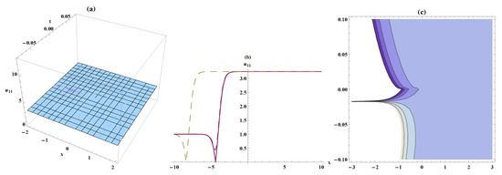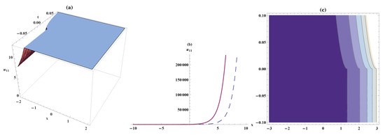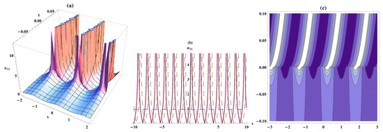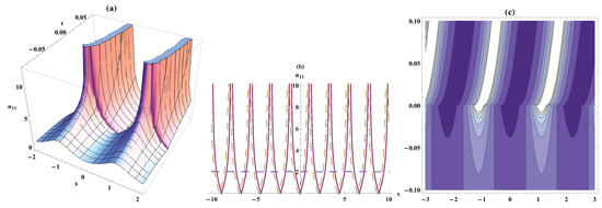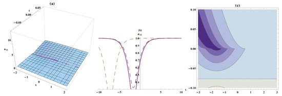 Solitary wave, the bistable wave amplitude, and contour plots for Equation (50). On the respective interval , ,
