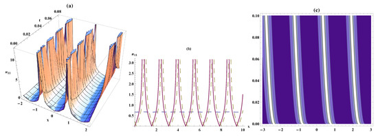 Periodic solitary wave, the bistable wave amplitude, and contour plots for Equation (11). On the respective interval , ,