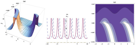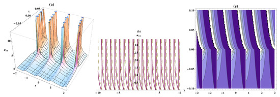 Periodic solitary wave, the bistable wave amplitude, and contour plots for Equation (29). On the respective interval , ,
