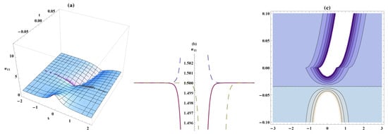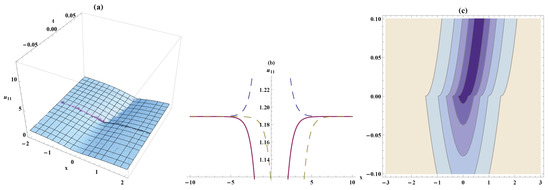 Solitary wave, the bistable wave amplitude, and contour plots for Equation (104). On the respective interval , ,