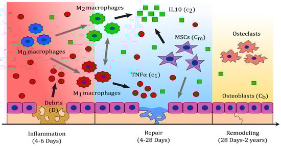 16]. During the inflammatory phase, macrophages modulate and resolve the inflammation while, during the repair phase, macrophages provide an optimal environment for the cellular proliferation, differentiation, and tissue production. The primary variables during the inflammatory and repair phases of the bone fracture healing process are debris (