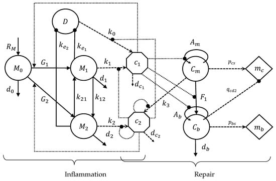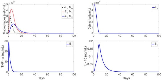 16]. This extension leads to a more realistic model, by incorporating the different phagocytic rates and the separate production of the pro- and anti-inflammatory cytokines by the two types of macrophages [