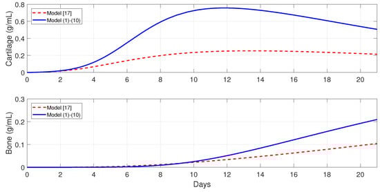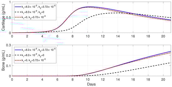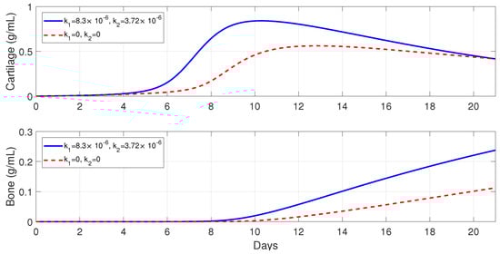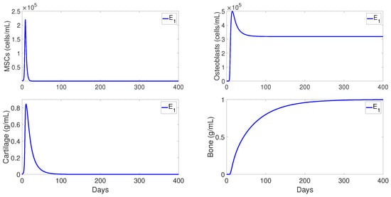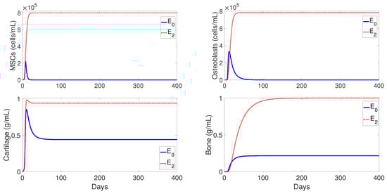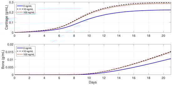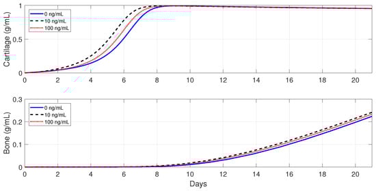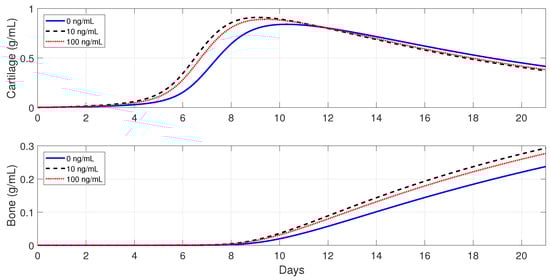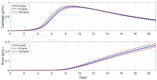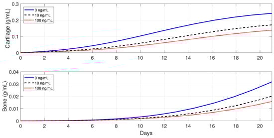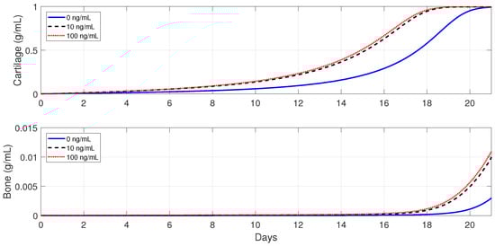 Figure 6 shows the qualitative evolution for the MSC, osteoblasts, cartilage, and bone densities for