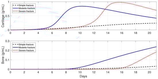 50]. For a moderate fracture, the maximal production of cartilage is observed around 10 days, followed by a significant degradation, while the bone tissue production occurs after the first week. For a severe fracture,