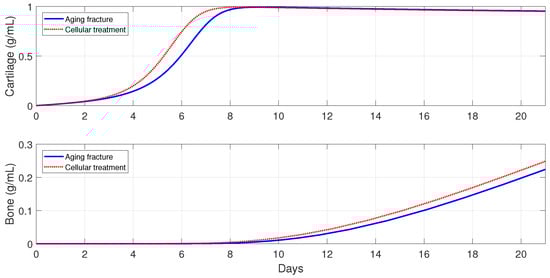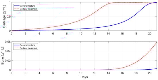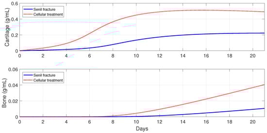 23]. In this section, Model (1)–(10) is used to explore these possible therapeutic treatments to accelerate the healing of a broken bone, under normal and pathological conditions such as severe fractures, advanced age, and senile osteoporosis [