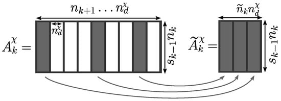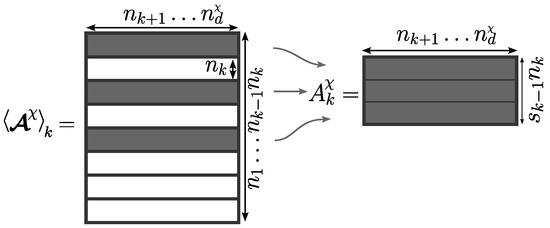 The tensorization and matricization steps are purely formal. No call to the DAE system solver is done here. They define the way the simulation data must be ordered in matrices to be approximated at the next iteration. The recursive definition of the matrix implies that the latter is equal to the kth matricization of a subtensor extracted from . Equivalently, the matrix corresponds to a submatrix of the kth matricization of , as illustrated in Figure 3.