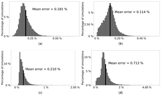 Empirical distribution of the errors for every mechanical variable. (a) Empirical distribution for . The size of the histogram bucket is %; (b) Empirical distribution for . The size of the histogram bucket is %; (c) Empirical distribution for . The size of the histogram bucket