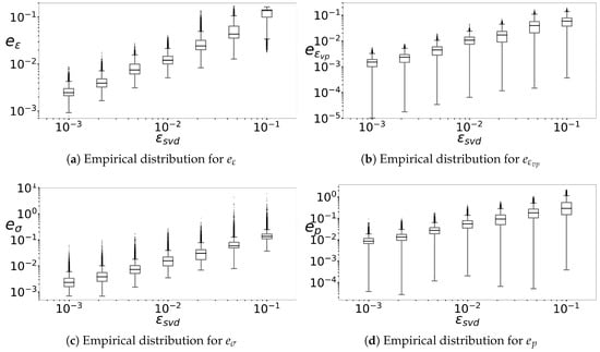 Figure 5a–d present the evolution of the relative error distribution (for the different mechanical variables) with respect to the truncation tolerance based on a random sample of 20,000 parameter set values chosen as in Section 3.3. Figure 6 details the graphical notations. The results empirically show for each mechanical output that the relative error decreases together with . This is consistent with the expected behavior of the algorithm.