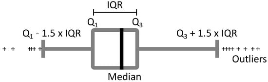 The left and right sides are the first and third quartiles (respectively and ). The line inside the box represents the median. The reach of the whiskers past the first and third quartiles is times the Interquartile Range (IQR). The crosses represent the outliers lying beyond the whiskers.