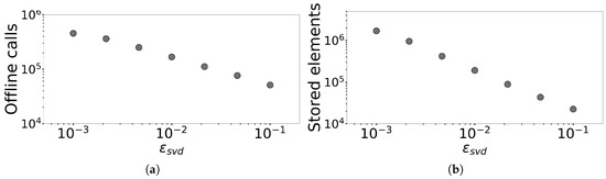 The plots in Figure 7a,b show the dependence of the number of stored elements and the number of calls to the physical model on .