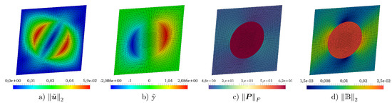 For the spatial discretisation, the standard Bubnov–Galerkin FEM is used. The continuum body is approximated by a mesh with for and , where denotes the number of elements. The displacement and potential fields in any finite element are approximated by the piecewise continuous vector-valued polynomials and scalar polynomials , respectively: