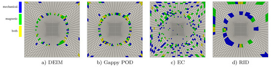 The number of elements in which either the mechanical or magnetic nonlinearity have to be computed are denoted by and , respectively. The aforementioned elements are highlighted in Figure 12. It is possible to use the same elements for the evaluation of the nonlinearities for all hyper-reduction methods except DEIM, rendering supposedly slightly less accurate but more efficient reduced models. However, for the sake of comparison of all introduced Hyper-Reduction methods, the nonlinearities are treated separately, resulting in two distinct sets of elements. In all these elements, the solution has to be computed based on the reduced solution with and denoting the number of DoFs involved in these operation performed in every iteration of the nonlinear solver.