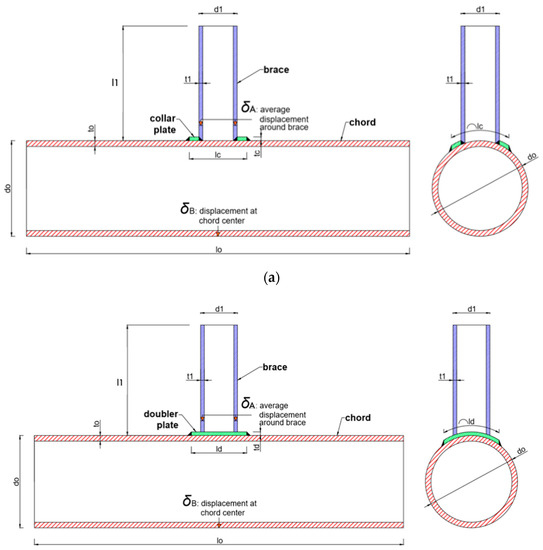 Scheme of specimens: (a) collar plate reinforcement and (b) doubler plate reinforcement.
