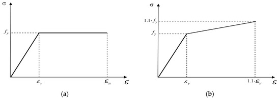 The use of this simplification in the true stress-strain relationship is commonly used in the design of structures because allows the designer to stay in the safety size due to the fact that no hardening is considered. This approximation, though, can lead to a result slightly different from the real behavior. For this, in Section 6, in addition to the elastic-perfectly plastic model, a model where the hardening is taken into account, as in Figure 2b, will also be considered.