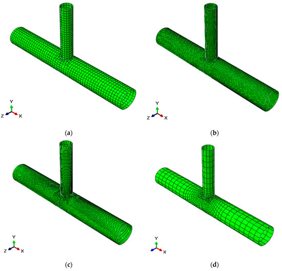 The coarse and medium mesh densities are obtained by imposing a unique size on the instance of the T-joint. The larger mesh has a size of 50, whereas the medium has a global size of 20, as depicted respectively in Figure 3a,b. The total number of elements is equal to 466 in coarse mesh, while 2745 elements are generated for the medium mesh. In the remaining cases, i.e., the fine and the article meshes depicted respectively in Figure 3c,d, the element sizes are varied in such a way that relatively smaller elements are used where the stress gradient is more critical. Therefore, the mesh density decreases from the vicinity of the intersection to the end of the brace or chord, and therefore smaller sizes in the vicinity of the brace-chord intersection. This strategy, to decrease the size while getting close to the critical area, is frequently used in FE analysis, because it allows to have an accurate study of the area most influential thanks to the small sizes, and at the same time to reduce the computational effort, due to increase of the sizes far from the critical point. Fine mesh has almost the same number of elements of the medium mesh, but their sizes, as aforementioned, are decreasing while going close to the intersection. For the article mesh, as in the fine one, the sizes are smaller near the intersection, this mesh is obtained from the mesh used by var der Vegte et al. [5]. Precisely, an equal number of nodes at each edge with almost the same factor of variation (decrease in size) is considered, so a total of 341 elements is obtained. In particular, by using the proportion between the geometries of the specimens in Table 1 and the graphic dimensions displayed by var der Vegte et al. [5], it was possible to discretize the FE model as depicted in Figure 4, in order to have the same nodes of the paper [5] at edges as previously stated.
