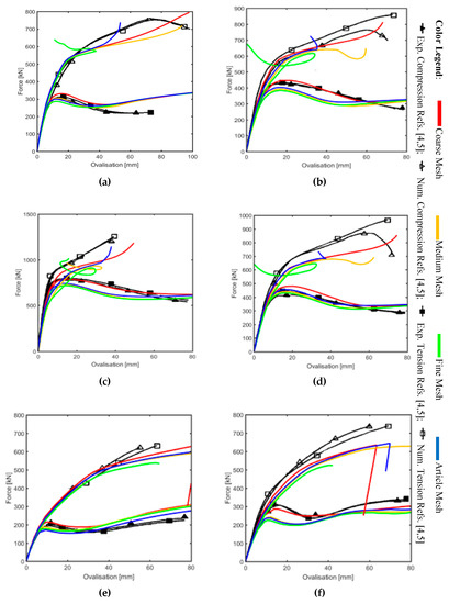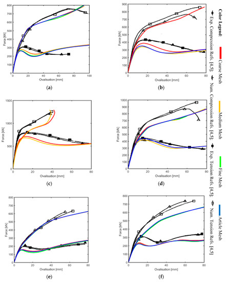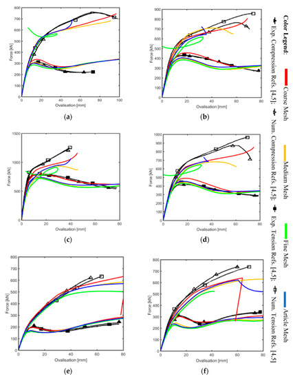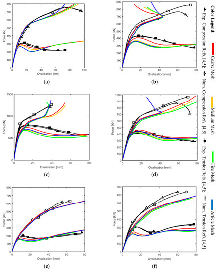Generally, for all the graphs it is easy to see a good fitting between the reference curves and the present work, especially for the unreinforced cases and for the coarse mesh of collar plate EX-03 and EX-04. The coarse mesh of EX-01, EX-02, EX-03, and EX-04 are depicted in Figure 6a–d.