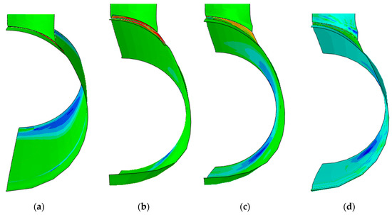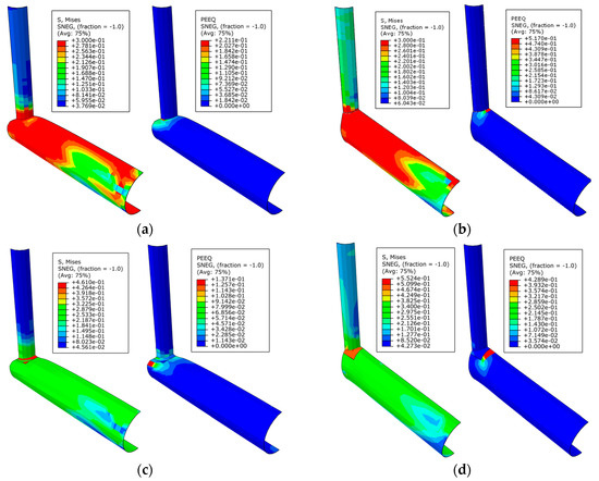 Figure 12g,h shows the localized indentation of the chord of the reinforced specimen EX-11 subjected to compression; besides the appreciable indentation at the intersection area, the doubler plate is observed to bulge out of its plane. Contrastingly, Figure 15c,d presents its sliced ring. The step taken here is at ovalization 80 mm, which corresponds to the period 0.537 of 1 Abaqus simulation time period.