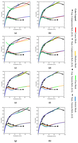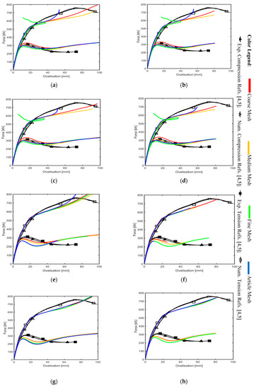 The graphs reported in Figure 5 represent the simulations done for meshes using the S4R element type (that are those given by default from the program), with an automatic step range. It is remarked that the lower curve for each graph refers to the compression specimens (i.e., EX-01 to EX-11 with odd numbers), whereas the higher one represents the tension specimens (i.e., EX-02 to EX-12 with even numbers).