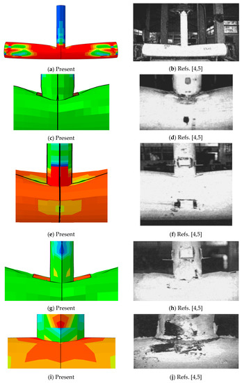 Figure 12i,j shows a detailed view of the brace-chord intersection of the unreinforced specimen EX-10 subjected to brace tension; also, after severe plasticization, the joint exhibited brittle shear failure of the chord wall at one side of the intersection. In the EC the focus is at the weld zone that is not present in the RC. Alternatively, Figure 15e,f presents its sliced rings, which shows very similar shapes. The time step taken here is at ovalization 80 mm, for a period 0.443 of 1 Abaqus simulation time period.