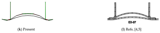 As far as EX-07 is concerned, the papers presented only the sliced result, as depicted in Figure 13i,j. The separation from the chord outer surface of the doubler plate (which at the original shape fits the chord perfectly) can be observed. As can be seen in Figure 13k,l, RC also has this effect but with no such emphasis as in the papers’ cases. This behavior is due to the fact while the brace compresses the chord, the wall of the latter has a different rotation with respect to the reinforcement; in the FE model the modeling of the contact and ties have played a fundamental role. In this the ovalization 80 mm corresponds to the period 0.531 of 1 Abaqus simulation time period.