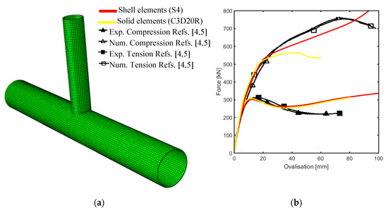 - Although the reliability of shell elements is the object of this research, a 3-D model with the same setting used by var der Vegte et al. [5] was built to verify the reliability of the preliminary parameters considered in the model with those of the numerical simulation [5], since assumptions were done in the first stage due to lack in the data in the reference papers. From the results of the 3-D model of this study, as depicted in Figure 16a, the load-ovalization curves in Figure 16b have been obtained where almost similar shapes and characteristics of the main model made by shells with S4 element type can be seen. Thus, it is possible to deduce that some relevant data are missing in the paper.