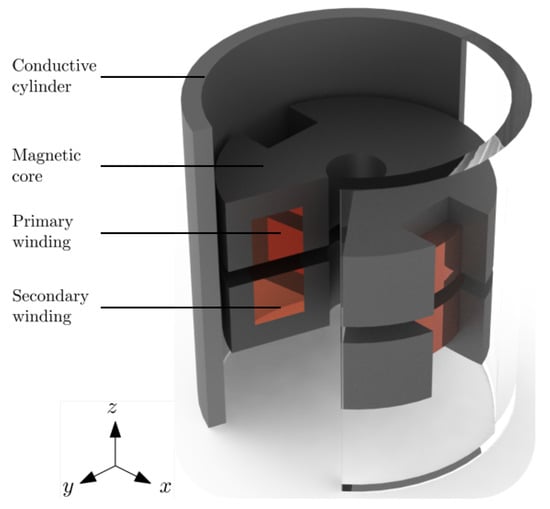 Overview of the investigated domain in three-dimensional space; pot core transformer confined by a conductive cylinder.