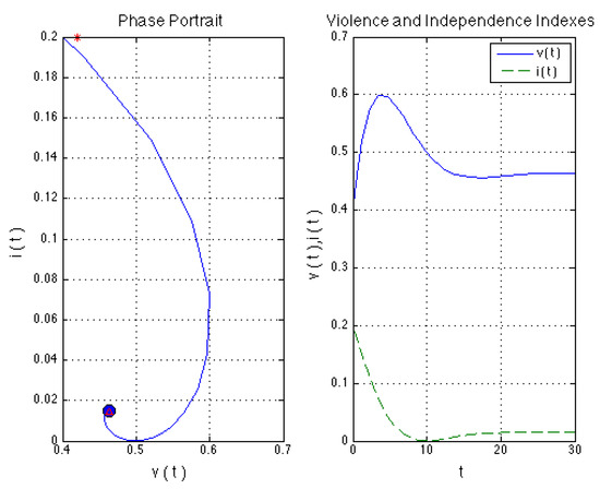 - Case 2. If and , or equivalently , then the equilibrium point is asymptotically stable and the solutions are not oscillatory. Notice that could be positive or negative. For this case, we can find a lot of possible parameter combinations which could lead us to this situation where the intimate partner interaction stabilizes rapidly. That means that the man’s violence and the woman’s independence indexes reach a stationary level and remain there for a long time. Observe that in this case, the inertias for both of the members of the couple could be similar or different, one from each other. However, independently of this, the level of IPV will be high when there exists high acceptance of machismo, low self-esteem or low self-regulation for the man. Otherwise, the model predicts a moderated level of IPV. Another fact is that depending on the value, the level of the woman’s independence will stabilize on a level of independence or dependency.