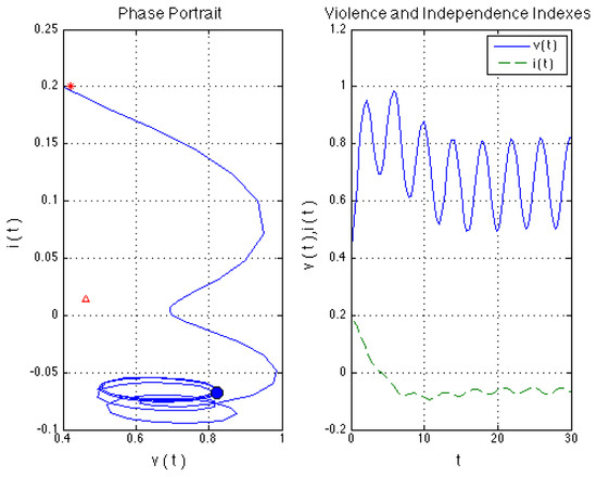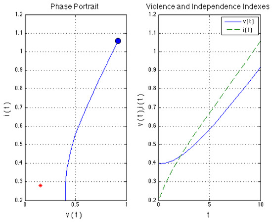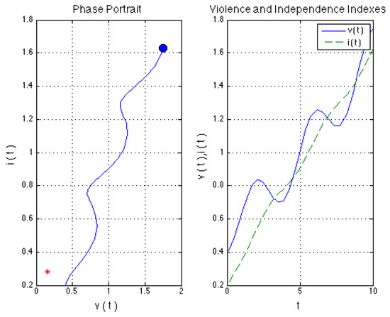 - Case 3. If and or equivalently, , then the equilibrium point is unstable and it is necessary that for the condition holds. Notice that the condition means that external factors are leading to an increment in the woman’s independence index. In particular, this could be achieved through empowerment programs for the woman. Then, our model reproduces the reported fact that this type of programs can lead to break the IPV cycle. But, it is important to remark that other situations must also occur. For example, if the coefficients and are relatively high, the coefficients and have to be close to zero, and high, or small. In any case, we will have a steep climb on the IPV or the woman’s independence.