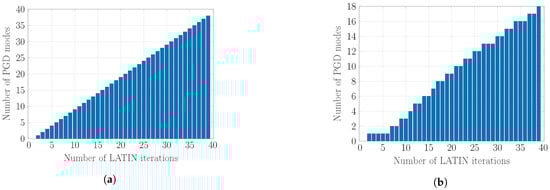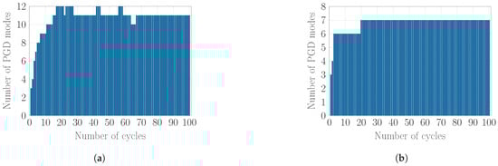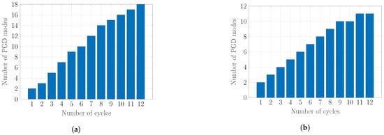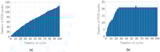 The simulation is carried out using Algorithms 1–4 and the resulting number of PGD modes with respect to the number of cycles is depicted in Figure 5. It is shown in Figure 5a that using Algorithm 1 resulted in an ROB with 18 modes while Algorithms 2–4 reduced this number to 11 modes by adding a maximum of one supplementary mode for each cycle. It is emphasised that Algorithms 2–4 provide the same ROB. However, their computational cost differs as illustrated in Section 4.3.
