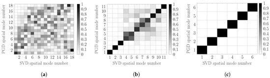 The inner product of the spatial modes in each case, after the last cycle, with their corresponding SVD of the acquired solution is shown in Figure 6. As expected, the GS modes are far from the optimal SVD ones while, trivially, Figure 6b depicts an almost diagonal matrix. The off-diagonal entries are caused by the temporal functions update at the final iterations.
