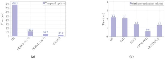 It is worth noting that, in this example, the SVD orthonormalisation schemes, other than e(R)SVD, were invoked 53 times only compared to 125 times with the GS algorithm. Hence, this explains the low computational requirements of Algorithms 2–4 in comparison with Algorithm 1 as summarised in Figure 9b. The e(R)SVD scheme was invoked in each LATIN iteration. However, due to the small number of generated modes, the required time to update the temporal functions is drastically decreased in comparison with the other schemes; see Figure 9a for a profiler summary.