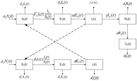 Under the above hypotheses, the following diagram illustrates the interactions of the Chikungunya infection in human and mosquito populations; see Figure 1.