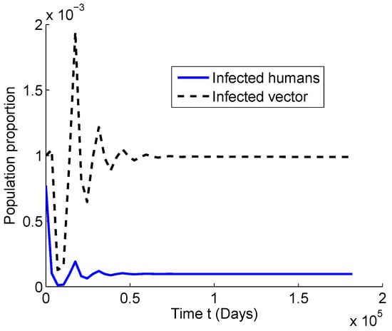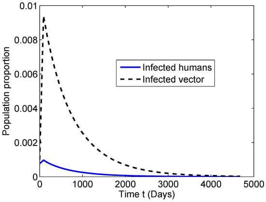 In this section, a set of numerical simulations using the mathematical model of Chikungunya (2) is performed in order to support the presented theoretical results and validate the importance of the threshold parameter . Those simulations also help us to better understand the relationships among the different groups of the human and vector populations, the parameters, and the dynamics of Chikungunya at the population level. The numerical simulations are presented using the proportions of the subpopulations in Model (2) in order to observe easily the dynamics of Chikungunya. In addition, the simulation results are presented using the parameter values presented in Table 1, which corresponds approximately to the current Colombian scenario. All simulations were done using an adaptive Runge–Kutta–Fehlberg method of order four [].