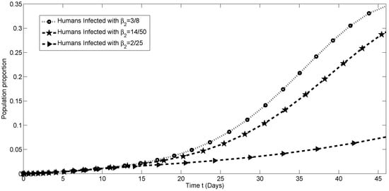 In the previous numerical simulation, we can see in Figure 4 that varying the transmission parameter allows us to observe the effect of this parameter on the dynamics transmission of the disease in the human and mosquito population. In all these simulated scenarios, the human population is exposed to the mosquitoes infected by the Chikungunya virus. Based on the fact that the human population exposed to the Aedes aegypti in Colombia is 19 million [] and assuming different values of the transmission parameter , we can roughly estimate the number of infected humans by Chikungunya virus, as given in Table 2.