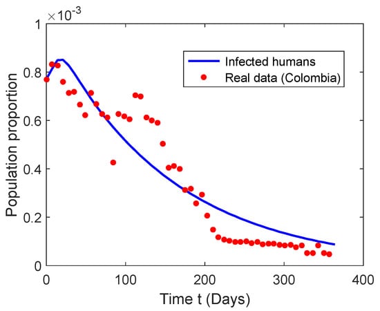 Numerical simulations are performed to support the theoretical results. In addition, the proposed mathematical model of Chikungunya is used to explain and understand the infected cases with the Chikungunya virus in Colombia. In particular, we use the proposed Chikungunya mathematical model to perform a fitting process to real data of Colombia. Additionally, we used bootstrapping and Markov chain Monte Carlo techniques in order to do analysis of the parameters’ identifiability [,,,,,,]. Finally, important policies and insights are provided that could help government health institutions in lowering the infected cases with the Chikungunya virus in Colombia.