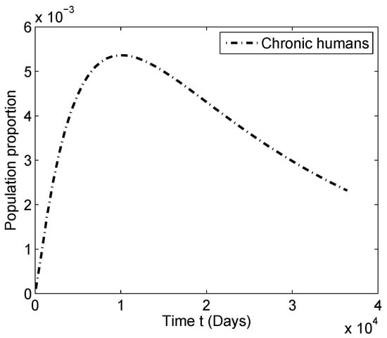 First, we perform numerical simulations of the Chikungunya model (2) when the threshold parameter in order to corroborate that the infected populations vanish and to observe the dynamics of the susceptible recovered and chronic populations. We run the simulations for a time long enough so we can observe both the transient dynamics and the steady states of the system.