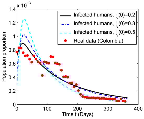 Best fits of the Chikungunya mathematical model (2) to the time-series data of Chikungunya in Colombia corresponding to the year 2015. The initial proportion of infected vectors varies from 0.2 (20%) to 0.5 (50%).