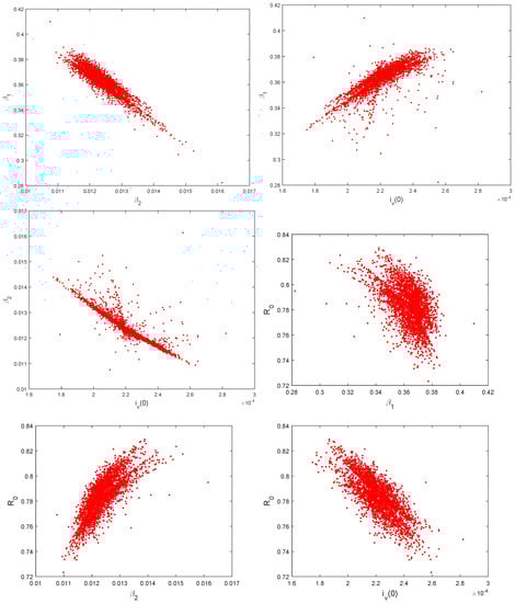 The bootstrapping method allows us to find correlations between estimated parameters. In Figure 9, several two-parameter scatter plots for each of the 3000 bootstrap replicates can be observed. In order to have two uncorrelated parameters, the scatter plot should be roughly a circle, with no clear relationship between the two parameters. For the parameter , the plots show a little bit of correlation, and this was in some way expected since is a factor on how strongly the epidemic starts. There is a clear correlation between the transmission parameters and . This correlation in some way is expected since both transmission parameters are related to the exposure of humans to mosquitoes and vice versa. However, it is important to remark that we are more interested in their product since the epidemic threshold parameter is proportional to this product. These results suggest that the threshold parameter of the mathematical model (2) is identifiable. Thus, we can use the model with caution to describe the dynamics of the spread of Chikungunya in the population of Colombia in the year 2016.