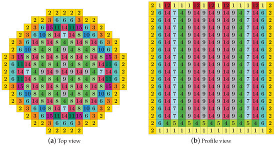 For a practical application of the preconditioners in a real reactor, we have chosen the configuration of the Ringhals rector. Particularly, we have chosen the C9 point of the BWRreactor Ringhals I stability benchmark, which corresponds to a point of operation that degenerated in an out-of-phase oscillation [23]. It is composed of 27 planes with 728 cells in each plane. A representation with more detail of its geometry can be observed in Figure 4. The spatial discretization using finite elements of degree three gave 1,106,180 degrees of freedom. The coarse mesh considered to obtain an initial guess for the MGBNM had 6709 cells and the problem associated with this mesh a size of 386,768 degrees of freedom. The computed dominant eigenvalues were , , , and . The corresponding fast fluxes are represented in Figure 5.