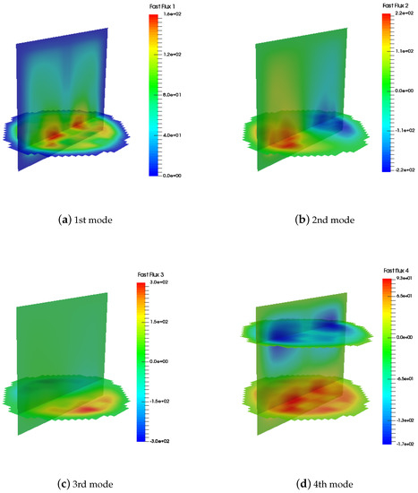 The NEACRP benchmark in a near-critical configuration [22] is chosen to compare the proposed methodology. The reactor core has a radial dimension of cm × cm per assembly. Axially, the reactor, with a total height of cm, is divided into 18 layers with height (from bottom to top): cm, cm, cm, cm, cm (10 layers), cm (two layers), cm, and cm. Figure 1 shows the reactor geometry and the distribution of the different materials. The cross-sections of materials are displayed in Table 1. The total number of cells of the reactor domain is 3978. Zero flux boundary conditions were set. The spatial discretization of the neutron diffusion equation, by using polynomials of degree three, gave a number of 230,120 degrees of freedom. The mesh built to obtain an initial guess had 1308 cells, and the computational time needed to obtain this approximation was 24 s. The four dominant eigenvalues computed are collected in Table 2. This table shows that the spectrum associated with the problem is clustered with two degenerated eigenvalues. A representation of the fast flux distribution for each mode is displayed in Figure 2.