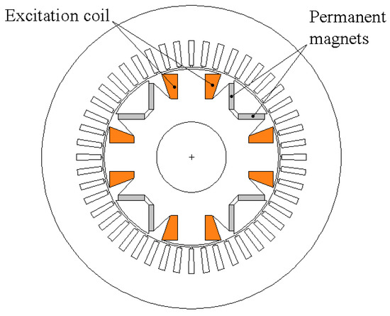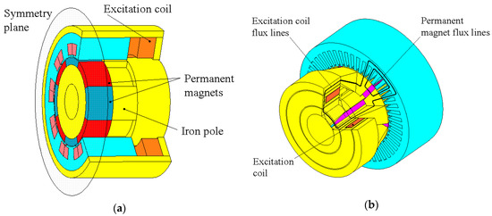 - Fu, X.; Zou, J. Numerical analysis on the magnetic field of hybrid exciting synchronous generator. IEEE Trans. Magn. 2009, 45, 4590–4593. [Google Scholar] [CrossRef]