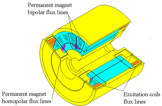 - Nedjar, B.; Hlioui, S.; Amara, Y.; Vido, L.; Gabsi, M.; Lécrivain, M. A new parallel double excitation synchronous machine. IEEE Trans. Magn. 2011, 47, 2252–2260. [Google Scholar] [CrossRef]