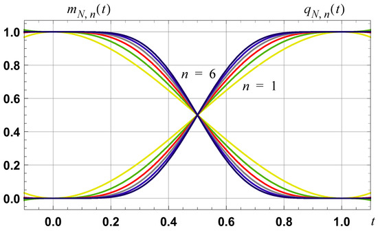 Graph of the normalized demarcation functions and as defined by (16). Such functions are infinitely differentiable on (0, 1), and have right and left hand derivatives, of all orders, that are zero, respectively, at the points of zero and one.