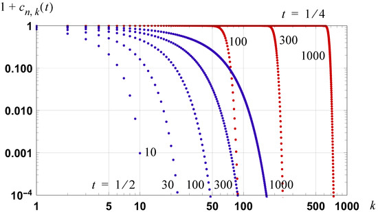It is clear that contains one less term than in the numerator and all terms are positive. Thus, and it is the case that with equality for the case of k = 0. For n and fixed, is a monotonically decreasing series for , as is clearly evident in the graphs shown in Figure 5. It then follows, from Abel’s test for convergence [22], that the series specified in (161) are convergent.