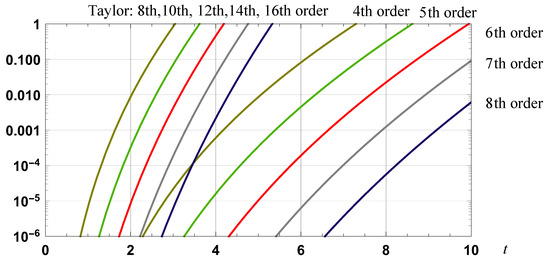 Graph of the 4th, 6th, 8th and 10th order dual Taylor series approximations, based on the interval [0, 1], for the function defined by (33).
