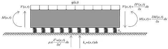 For the transverse vibration of an Euler–Bernoulli beam (shown in Figure 1) resting on a Winkler elastic foundation, the equilibrium conditions are: