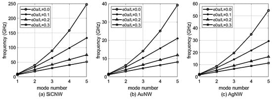 Variation of the first five natural frequencies of nanowires with respect to e0a/L.