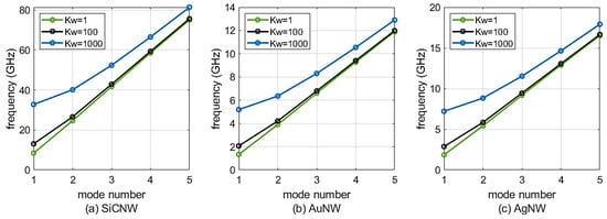 Effects of both temperature rise and the Winkler parameter on the first three natural frequencies of nanowires are revealed in Table 8. It is apparent from the table that an increase temperature rise led to a decrease in frequency, contrary to the Winkler parameter. Also, it can be emphasized that the frequencies of AuNW were more affected than the other nanowires because of their related material properties, given in Table 1. Moreover, it can be observed that the influence of temperature rise was more prominent for lower modes and smaller Winkler parameters.