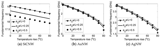 Figure 4 displays the variation of fundamental frequencies of the three embedded nanowires with respect to temperature rise for various small-scale parameter values. It can be recognized from the figure that the effect of e0a/L was more prominent for SiCNW than the other ones. On the other hand, the influence of temperature rise was more significant for gold and silver nanowires than the silicon carbide nanowire.